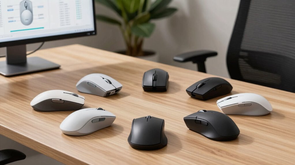 When choosing an ergonomic mouse for long hours, I consider how well it fits my hand size and the adjustability of its DPI settings for different tasks. I also look at wireless options and battery life to guarantee it stays reliable during extended use. Finally, I focus on design features that promote comfort and reduce strain over time.